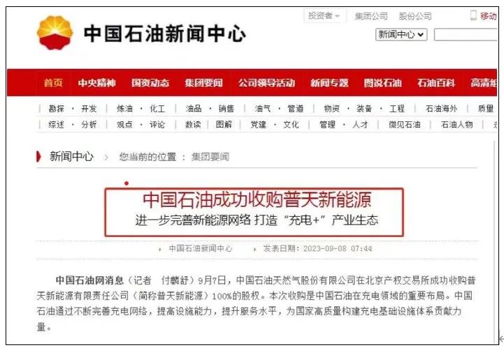 华夏能源网(公众号hxny3060)获悉,9月7日,中国石油正式收购普天新能源100%股权,此次股权转让的挂牌底价近15亿元。
