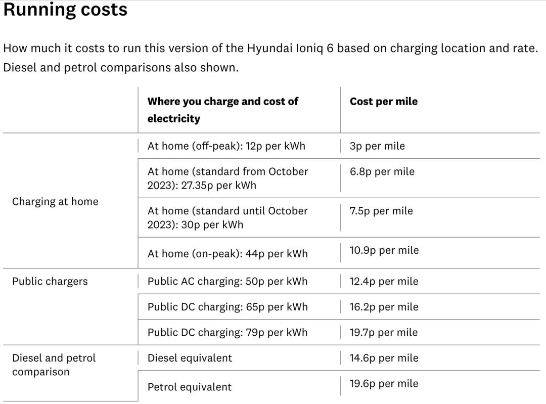 但在天然气价格回落,电价回归正常的情况下,欧洲的公共充电桩价格依然惊人。以现代Ioniq 6 为例,在英国公共直流充电成本最高可达0.23欧元/英里(19.7便士/英里),几乎与同级别汽油车相近,比同级别柴油车贵30%以上[5]。