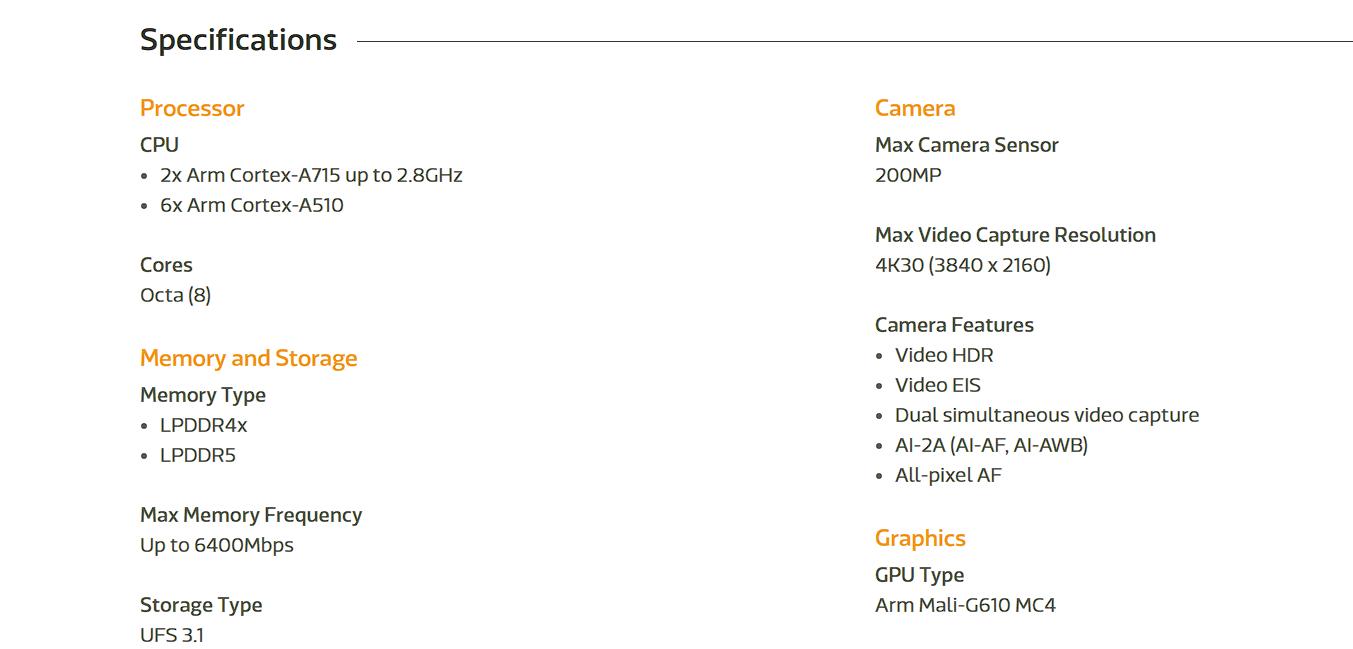 配置了两枚2.8Ghz Cortex A715大核心+六枚 2.0Ghz Cortex A510小核心,GPU采用了Mali G610 MC4 四核心架构。