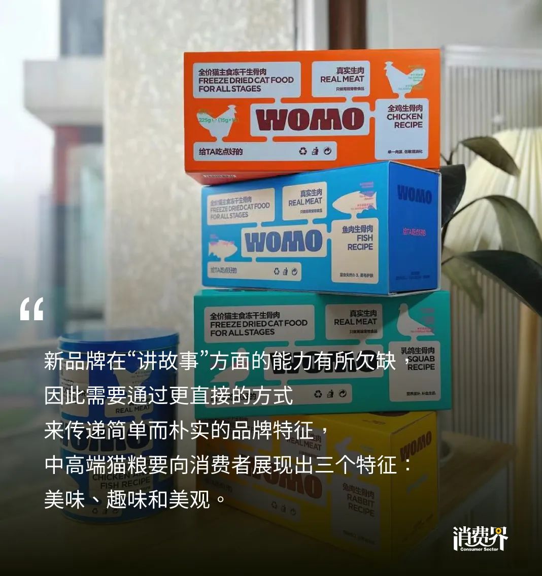 新品牌在“讲故事”方面的能力有所欠缺,因此需要通过更直接的方式来传递简单而朴实的品牌特征,中高端猫粮要向消费者展现出三个特征:美味、趣味和美观。让猫粮不仅是一种必需品,更是一种享受。让消费者感受到WOMO猫粮的美味,让猫儿们享受到吃粮的乐趣,让包装设计呈现出简洁而精致的美感。
