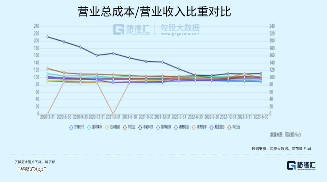 上半年出货量靠前的企业如宁德时代、亿纬锂能、国轩高科规模效应明显,只有他们的营业总成本所占营收比重是随着出货量规模的提升而下滑,其中材料成本的增速随着原材料价格下降相比一季度要收窄了一些。