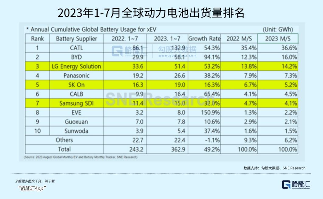 出货量前十名除了宁王依然守着三成份额外,日韩系企业的份额比去年同期下滑了2.3个百分点,反映了中系电池企业集中度持续提升。