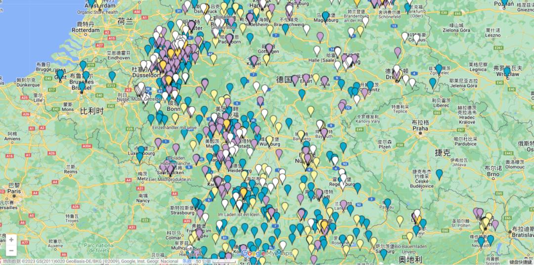 环保者SHIA自制的德国无包装商店地图(其中蓝色点为无包装商店、黄色点为提供无包装附加优惠的商店)图 |零废弃卡丁车
