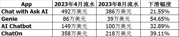 可以看出,随着 ChatGPT“本尊”入场,这些依靠接入 ChatGPT API 变现的产品盈利空间也被明显挤压,还有进一步下滑的趋势。产品的同质化导致营收压力上升,AI 聊天产品也需要跳出之前的功能思路,建立新的机制和变现策略。