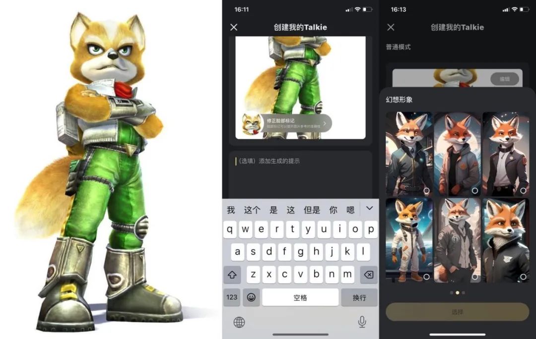 创作机器人形象需要用户上传样本图片,「Talkie」一共设计了两种创作模式:普通和高保真。普通模式只需要上传一张形象图,高保真模式则需要上传 20-40 张人像照片,生成一个“Avatar”。用户还可以增加对机器人的形象描述,增强准确性。之后「Talkie」会直接用 AI 生成聊天机器人的 2D 备选图片,用户需要从中挑选一张,确定机器人的最终“长相”。
