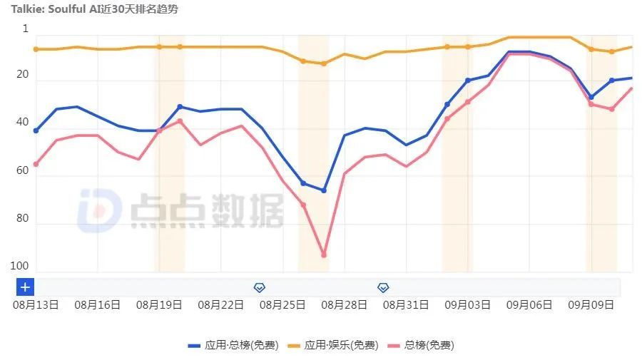 直到最近,我们在美国市场看到了一款比较有意思的聊天产品「Talkie:Soulful AI(以下简称 Talkie)」。产品在今年 6 月 16 日正式上线,8 月 27 日开始美国 Google Play 下载榜排名迅速蹿升,截至 9 月 7 日美国 Google Play 非游下载总榜已经跻身 Top 5,下载总榜位居第六位(点点数据)。之后虽然排名有小幅回落,但截止到 9 月 11 日(今天)依然位居美国 Google Play 非游榜第 19 位,总榜第 23 位。