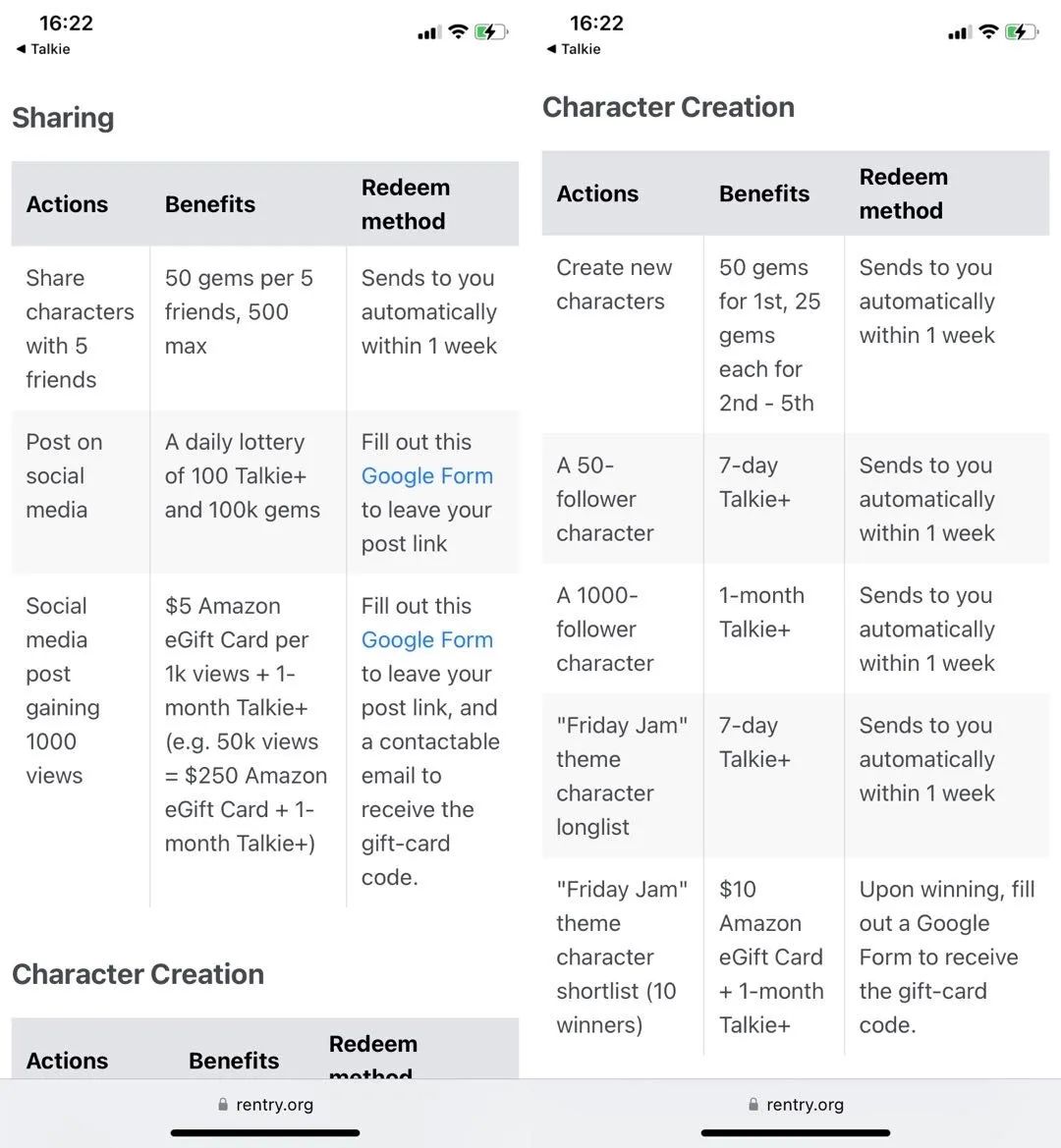 在前期宣发方面,「Takie」则相当注重用户在社媒上的宣传以及鼓励 UGC 创作。「Talkie」从 9 月 1 日发起了两个有奖活动,分别鼓励用户在社媒上宣传「Talkie」和创作更多 AI 聊天机器人。如果用户在社交媒体上的分享帖点击量过千,那么每 1000 次点击就能换来 5 美元的 Amazon 电商礼品卡;如果用户创作的 AI 聊天机器人符合限时活动“Friday Night Jam”主题并进入人气排行榜 Top 10,那么也能获得 10 美元的 Amazon 礼品卡。
