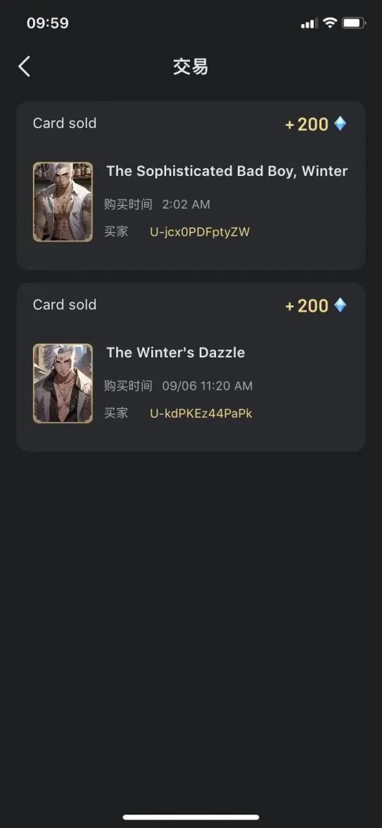 抱着尝试的心情,笔者和朋友在卡牌商店上架了三张卡牌,商店里的卡牌价格大约在 50-500 颗钻石不等,笔者将手里的两张卡牌定价在 200 颗钻石。让笔者出乎意料的是,所有三张卡牌在上架 1-2 天后都已经成功出售,其中一张卡牌更是获得了 7 次点赞。这样来看,「Talkie」的卡牌市场还是比较活跃的。但我们依然认为,仅在聊天场景中与不同形象和性格的 AI 聊天机器人产生交互,然后去收集该形象并不稀缺的卡片,虽然能说得通,但没有强说服力。