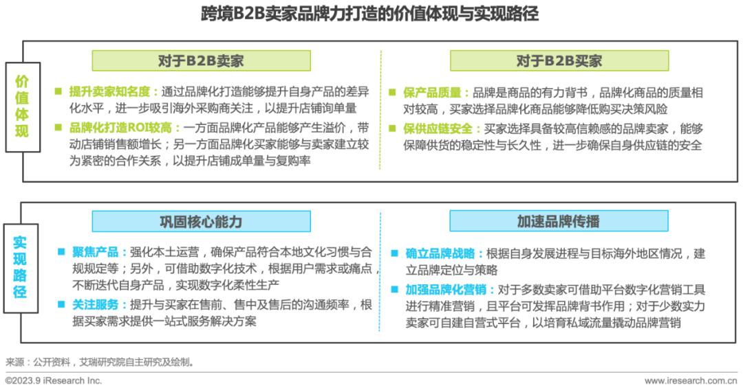 跨境出口B2B卖家曾围绕中国制造的高性价比优势出海,但随着宏观层面贸易环境的改变及微观层面海外采购商的需求变化,中国跨境卖家品牌化转型的意识愈发明显,开始重视与消费者建立长期的信任关系。于B2B卖家而言,通过品牌力打造能够实现自身知名度、产品附加值和投资回报率的提升;于B2B买家而言,选择品牌化卖家能够确保产品质量与供应链安全。基于品牌力打造的价值体现,B2B卖家可通过聚焦产品与关注服务两方面巩固核心能力,并通过确立品牌战略与加强品牌化营销两方面来加速品牌传播。