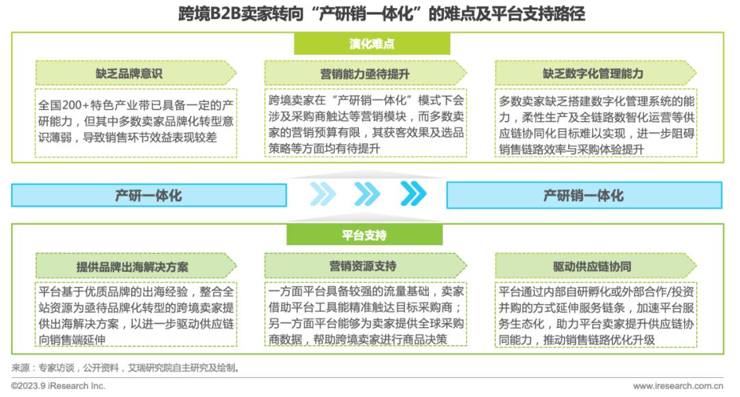 中国跨境出口电商产业带已具备一定的产研能力,而跨境卖家从“产研一体化”演化至“产研销一体化”则存在较多难点,如缺乏品牌意识、营销能力亟待提升以及缺乏数字化管理能力等,导致销售链路运作效率较低,目前“产研销一体化”模式尚处探索阶段。跨境出口B2B平台作为连接产业链上下游的中间者角色,通过提供品牌出海解决方案、营销资源支持以及驱动供应链协同等方式赋能上游卖家的供应链向销售端延伸,这将助力跨境卖家逐步实现“产研销一体化”。