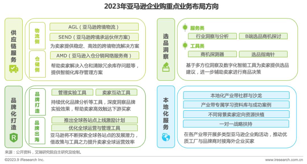 历经近十年探索与沉淀,亚马逊企业购根据中国卖家的需求与痛点积极开展全链路服务与产品的布局,目前已触达全球600万+企业及机构买家。2023年亚马逊企业购将继续围绕供应链服务、选品洞察、品牌化打造以及本地化服务四个业务方向,不断提升全链路服务能力,赋能中国优质工厂与品牌商开拓海外站点。
