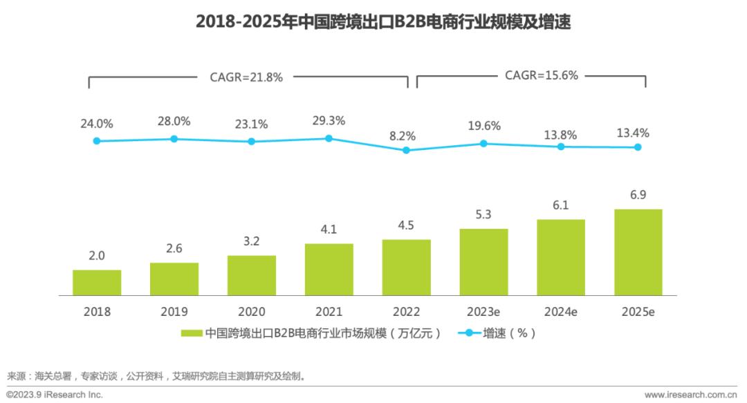 跨境出口B2B一直是跨境出口赛道的核心组成部分,占整体行业规模的比例为近7成,2018-2022年的年均增速达21.8%。2022年,行业在遭受局部封控、供应链危机和国际争端等多重阻力下依旧保持较强韧性,同比提升8.2%,规模增至4.5万亿元。受益于行业数字化能力的逐步成熟和配套服务的日益全面,未来跨境出口B2B电商行业预期增速将高于传统外贸行业,2022-2025年的年均复合增速保持在15.6%,行业发展稳中有质,2025年行业规模有望提升至6.9万亿元。