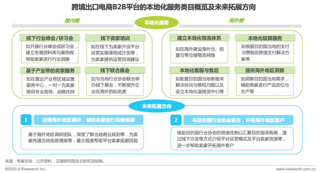 部分跨境卖家的运营能力薄弱且缺少海外服务环节,这也导致这些卖家开拓海外站点的进程被放缓。在此情况下,平台也通过多种方式,从国内侧与海外侧持续创新本地化服务,助力跨境卖家出海,例如在国内侧提供线下卖家培训以及基于产业带的卖家服务等,在海外侧建立本地化物流体系与提供本地化结算服务等。未来平台方预计会进一步拓展本地化服务板块,比如通过强化海外地区调研能力帮助卖家进行风险规避以及与目的国行业协会联合开展线下沙龙等以开拓海外地区客户,多方位支持平台卖家“走出去”。