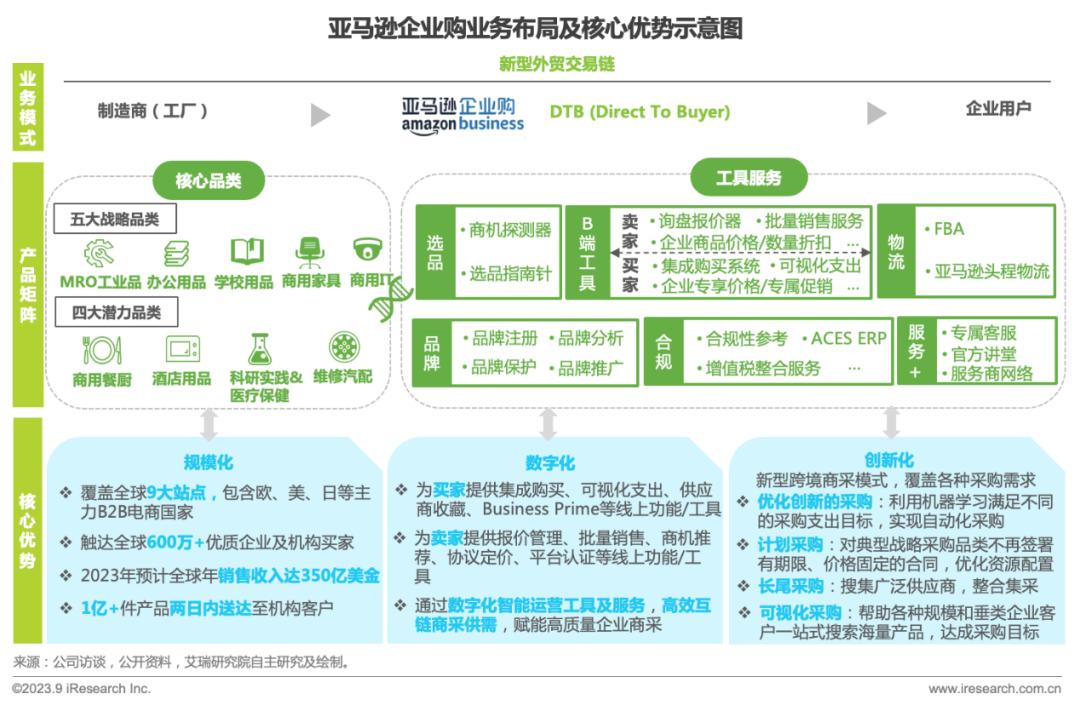 亚马逊企业购2017年在中国落地,深耕跨境出口B2B赛道,并于2022年创新提出DTB模式,减少进出口商、分销商等中间角色,在帮助国内供给方通过数字化渠道更直接地触达海外终端企业和机构的同时,也提升需求方在各阶段各品类上的采购效率、降低采购成本。亚马逊企业购运用自身广泛的商品储备和覆盖全链路的智能工具打造出集合产品与服务于一体的矩阵,并围绕规模化、数字化和创新化的核心优势不断拓展与深化产品和服务能力,巩固加深竞争力。