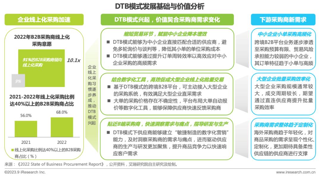 调研数据显示,2022年超九成采购商会选择通过线上化渠道来满足自身采购需求, 2022年线上化采购比例达40%以上的B2B采购商占比达到68%,相比2021年增长12%,B2B采购商线上化采购习惯逐步养成,驱动B2B线上化进程持续深化,不断缩短交易链路,进一步带动DTB模式兴起。跨境出口B2B平台基于DTB模式能够进一步赋能中小企业降本增效、高效促成大型企业线上化批量交易以及指导供应商定制化研发与生产,DTB模式所释放的价值能够契合下游各类型采购商的需求变化,极大提高B2B买卖双方的交易效率。