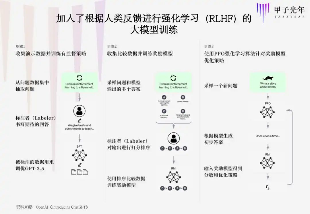 这些重复性的工作背后,实际上是为了实现“根据人类反馈进行强化学习”(Reinforcement Learning from Human Feedback)的技术,GPT-3.5的最大提升便来自于此,其中的关键,是人(Labeler)的参与,也就是这些数据标注员。