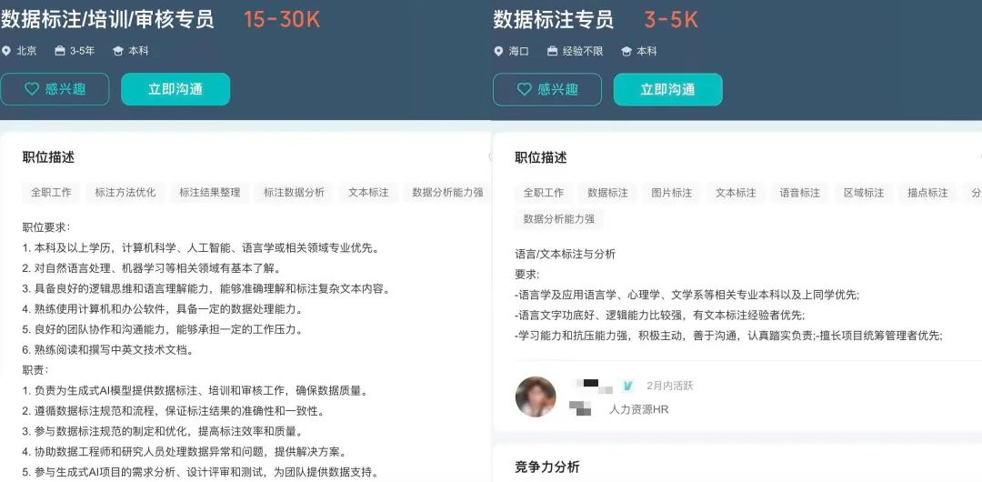 通过对比百度在北京总部和海口数据标注基地招聘的标注员岗位介绍可以看出,同样是为了训练大模型,前者为高级标注员,负责指导、培训和审核,而后者则是基础的数据标注员,两者在薪资水平上千差万别。