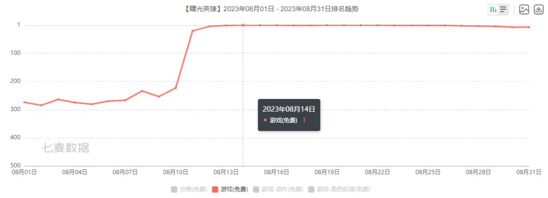 竞技世界旗下的「曙光英雄」,作为一款 2020 年就已经上线了的老牌手游,8 月初其迎来了破圈式爆发增长,在 App Store 游戏免费榜排名突然从寂寂无名的“200+”直线上升,于 8 月 14 日成功登顶并蝉联数日。