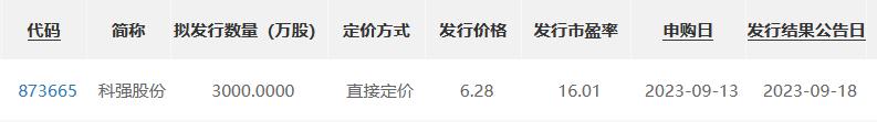 科强股份(873665)北交所网上申购时间为9月13日的9:15-11:30,13:00-15:00,发行价格为6.28元/股,发行市盈率为16.01倍,发行代码“889099”。