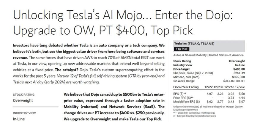 大摩称,Dojo 让特斯拉从「汽车公司还是科技公司」的争议中,开始变得更像是一家科技公司。