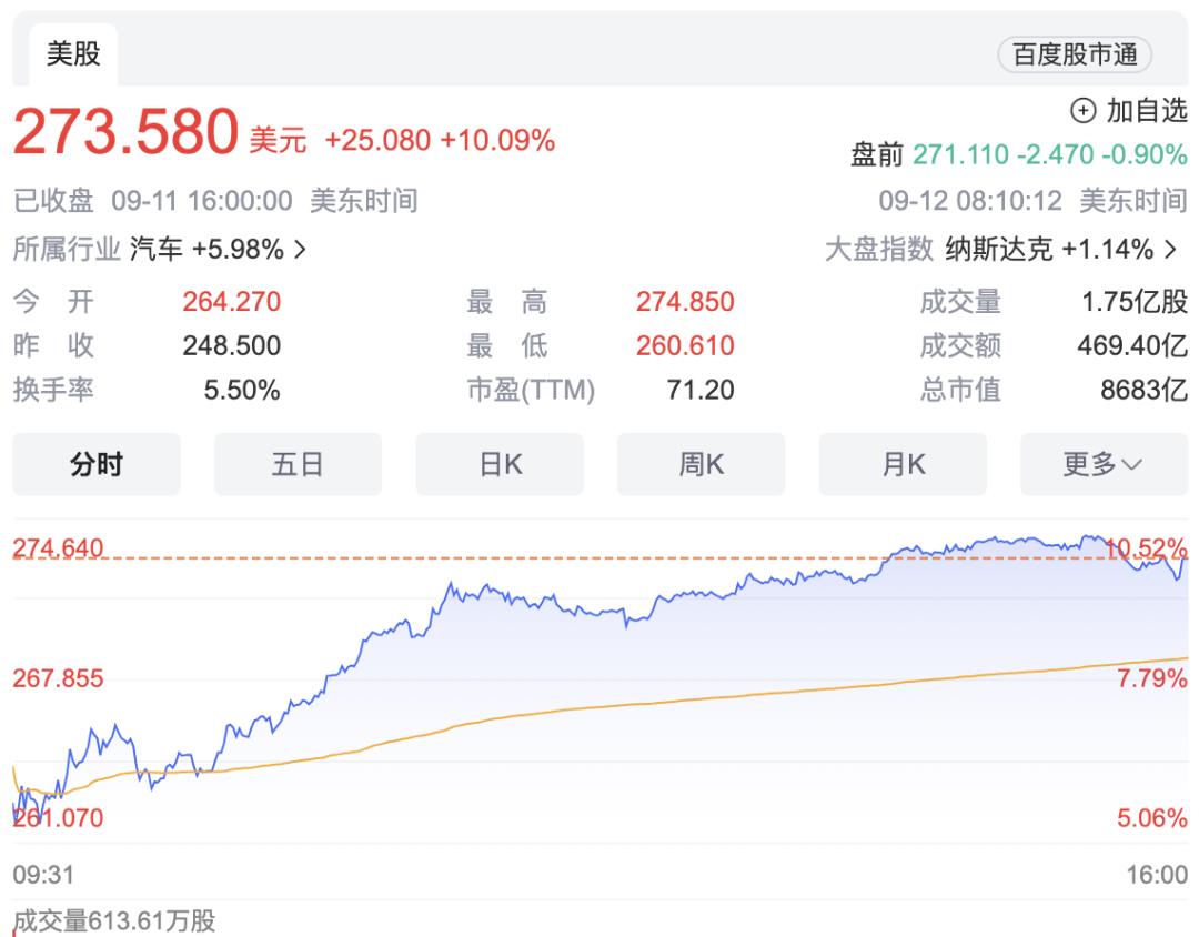当地时间 9 月 11 日,特斯拉股价暴涨 10.09%,报收于 273.58 美元,市值 8683.41 亿美元,其市值一夜增加 799 亿美元(约合人民币 5800 亿元)。