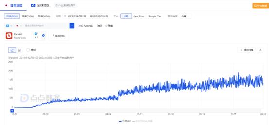 2019 年—2023 年 8 月,Paralell双端DAU 数据| 图片来源:点点数据