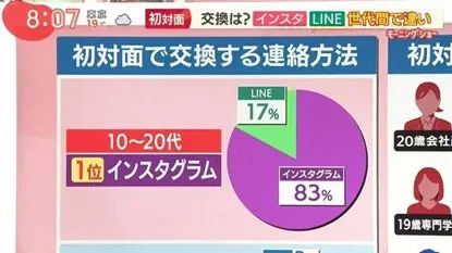 首先来看日本社会的社交习惯:存在明显的社交界线,人际交往时会将生人与熟人分开。例如,LINE 虽然是日本的国民聊天软件,相当于微信,但是日本人只会在 LINE 上添加与自己关系非常亲密的同事、朋友和家人。而新认识的朋友或者普通朋友,一般都使用 Instagram 进行联系,算是半熟人社交的范畴。这里有一个小调查可以证明这一点,在 30 岁以下的人初次见面时只有 17% 会交换 LINE,绝大多数人会交换 Instagram。