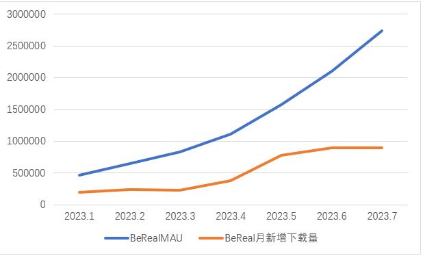 在点点数据中观察 BeReal 近期的数据,发现进入 2023 年它在日本市场增长非常快,MAU 从 1 月份的 50 W 左右,增长到了 7 月份的 270 W。