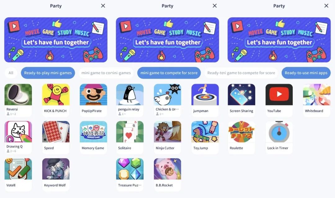 Party 标签,从左到右分别是,与好友一起玩的游戏,单人游戏,迷你组件|图片来源:Parallel