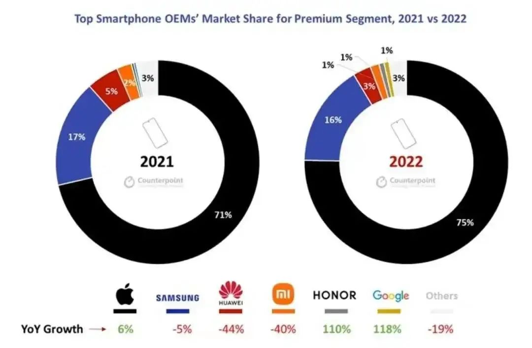 ( 2021、2022年全球高端市场格局 图源:counterpoint)