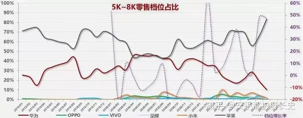 (2019-2021 中国5k-8k 手 机零售档位占比 图源: 知乎安乎都护府长史)