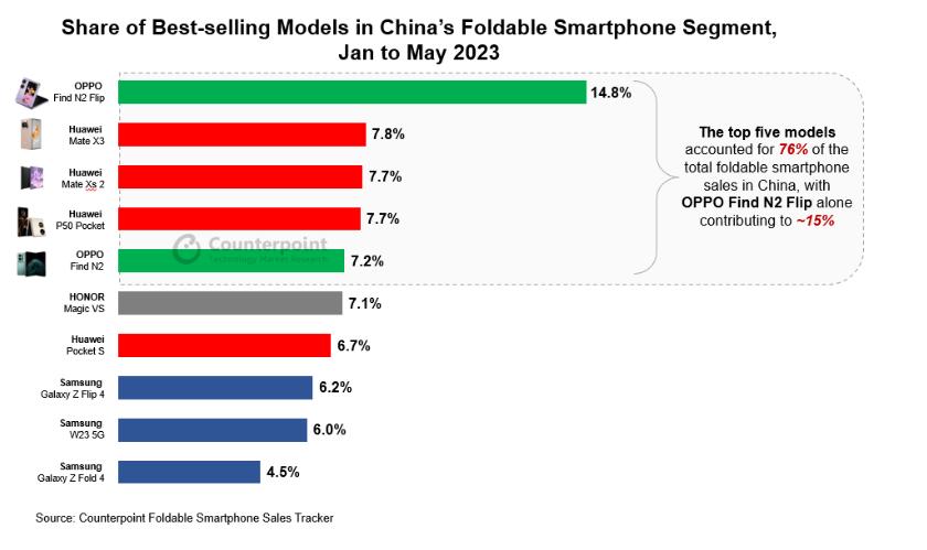 (2023年1-6月中国折叠屏手机 市场销量份额 图源: counterpoint)