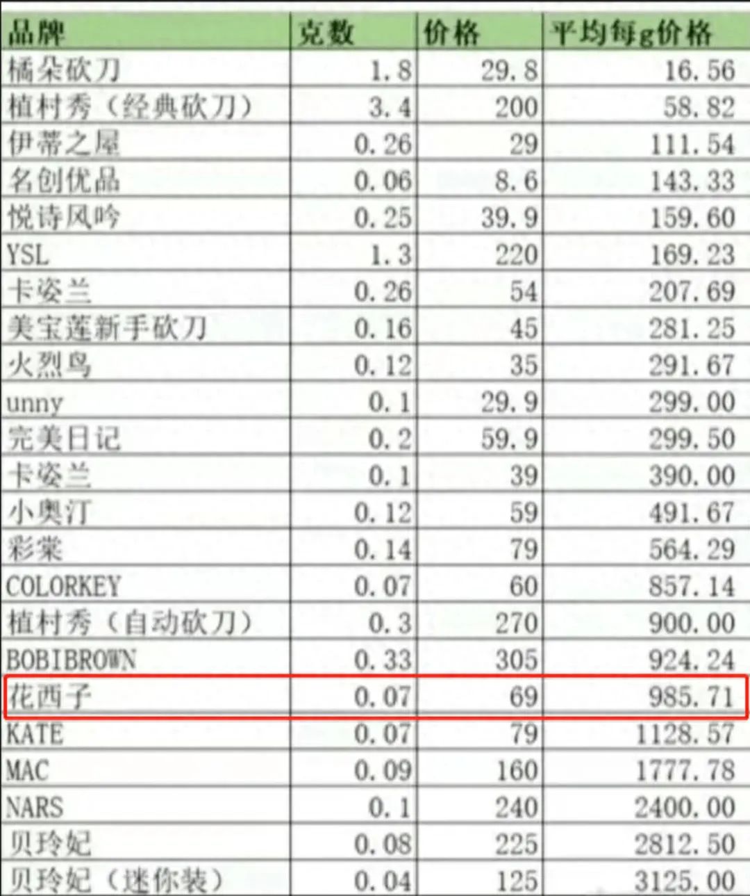 一张爆款眉粉每克均价的统计表在网上广为流传。化妆品的规格相差巨大,以每克均价计算价格是比较公允的对比方法。以此来看,花西子眉笔每克单价高达985.71元,能买2克黄金。即便是与国际大牌相比,其单价也毫不逊色,相比之下,植村秀的经典砍刀眉笔每克价格仅为58.82元。