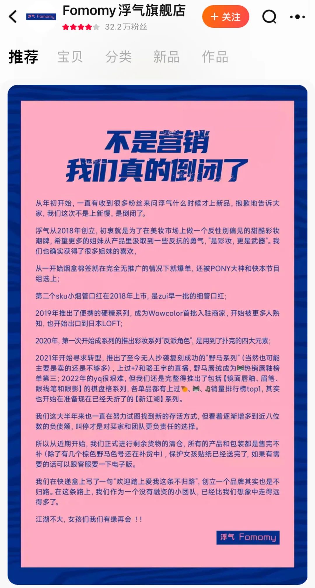 就在李佳琦“翻车”的前几天,知名彩妆品牌浮气(Fomomy)突然宣告倒闭;而在上个月,国货彩妆品牌卡乐说(Colorpedia)正式发文告别中国市场。其中,浮气的“野马系列”曾上过李佳琦的直播间,达到天猫热销唇釉榜单第三,并有多款单品跻身天猫、抖音销量排行榜第一。