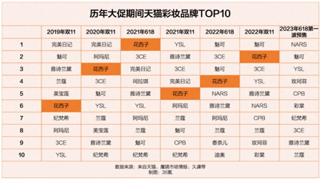 《FBeauty未来迹》总结出6·18天猫平台预售阶段(5月26日晚8点~5月31日0点)的10张品类和单品榜单。在彩妆品类里,相比2022年,今年一个显著的对比是,彩棠跃升,花西子下滑。