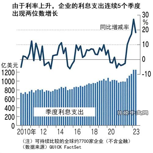 约7700家企业2023年4~6月的利息支付额约为1250亿美元,比上年同期增加约2成。尤其是最近,连续5个季度出现了两位数的增长。