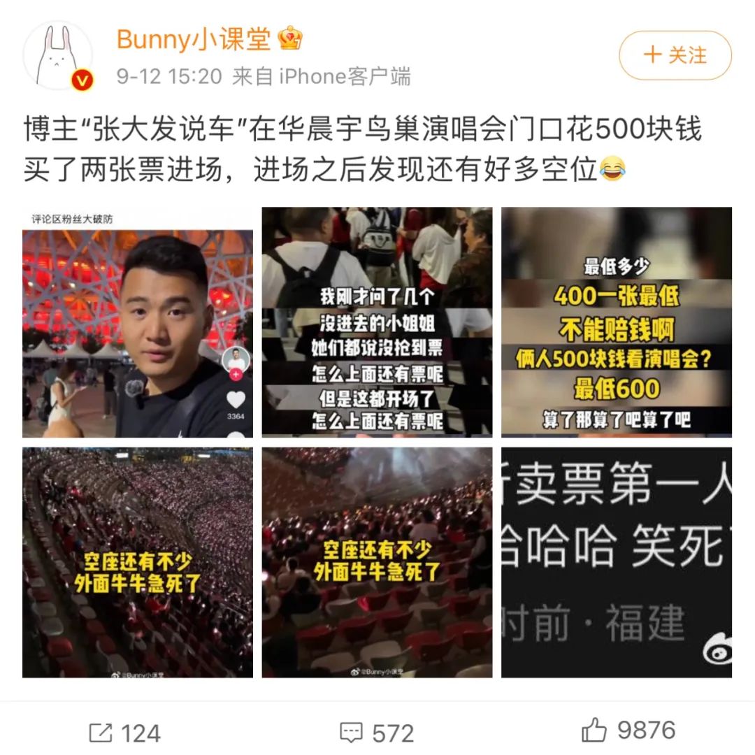 像是华晨宇此番8月26日开启售票的北京鸟巢演唱会,临近开唱前一天(9月8日)仍有大量余票未能售出,而黄牛圈层更是出现低价打折出售,表示“主办方只求位置不空着尴尬”的说法。