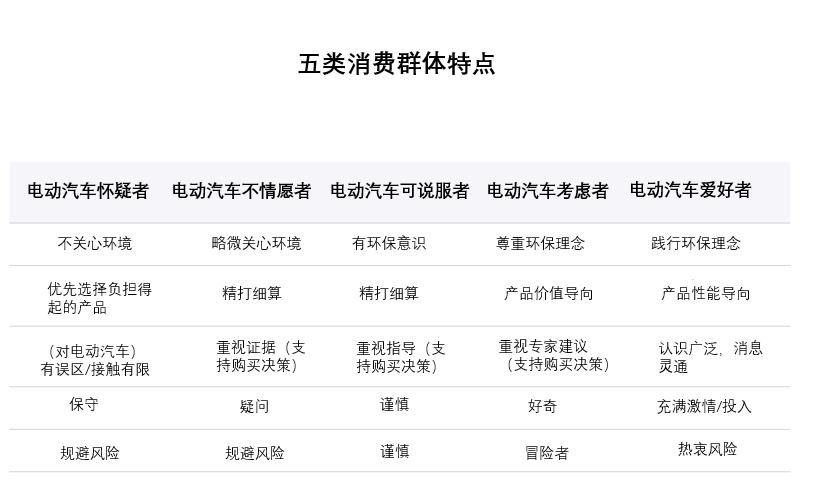 这些电动汽车质疑者(怀疑者和不情愿者)对电动汽车了解很少,他们天性保守,热衷规避风险,是汽车制造商和经销商最难触及的消费者群体。但他们的优势在于具有强烈的成本意识,一旦电动汽车总拥有成本表现优秀,就可能影响他们的购车意愿。