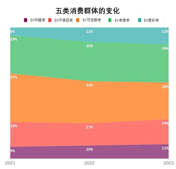 安永跟踪发现,电动汽车爱好者的占比正在持续提升,从2021年的6%,到2022年11%,2023年达到13%。与此同时,可说服者和考虑者细分市场出现了一定的萎缩,而怀疑者和不情愿者占比在2023年增长2%,对电动汽车说“不”的消费者群体数量也在增加。