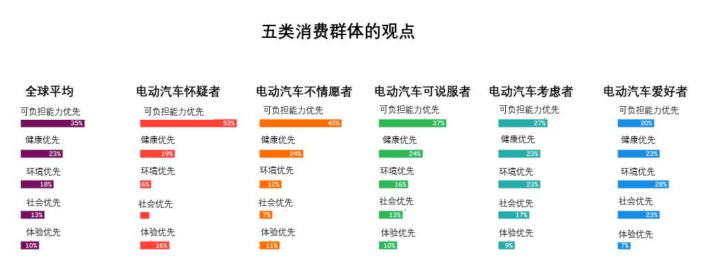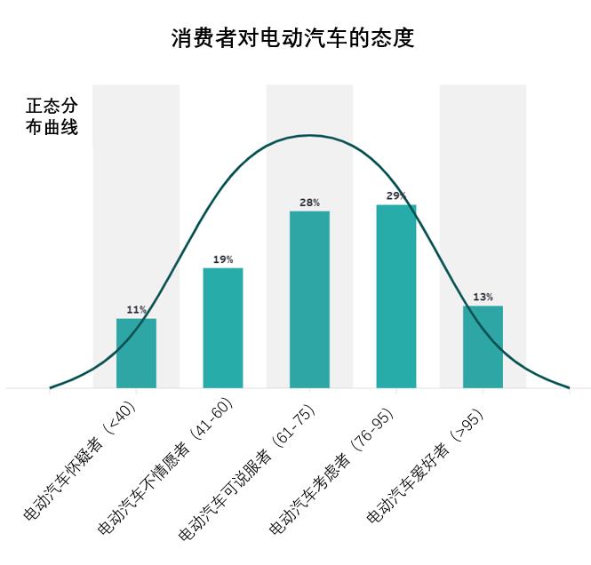 根据受访者对电动汽车自身、可持续性发展、成本考虑和移动偏好等“EV意识”的打分(1-100分),形成了五种不同的消费者群体,分别是:电动汽车怀疑者(EV Skeptics)、电动汽车不情愿者(EV Reluctants)、电动汽车可说服者(EV Persuadables)、电动汽车考虑者(EV Considerers)、以及电动汽车爱好者(EV Enthusiasts)。
