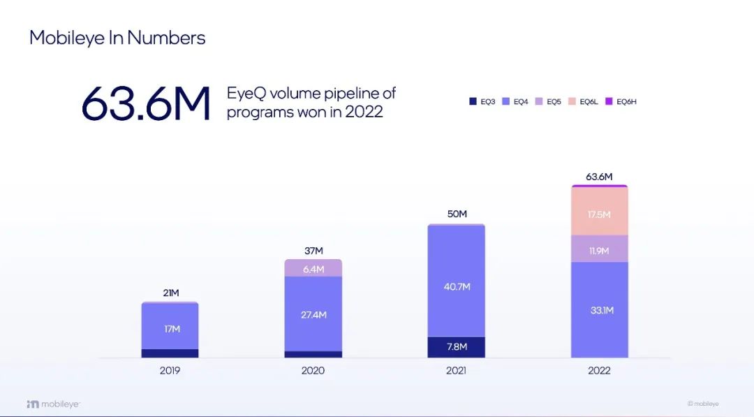 2022年,Mobileye新增订单超过6300万片,其中EyeQ5L和EyeQ5H的订单合计超过2900万片,占总量的将近一半。