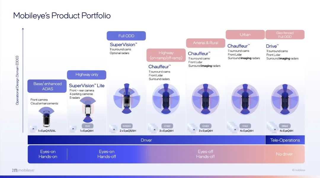 - 从EyeQ5开始走向EyeQ6和EyeQ Ultra,Mobileye正切换到提供高速、城区,并且逐步实现脱手、脱眼的高阶智驾功能。