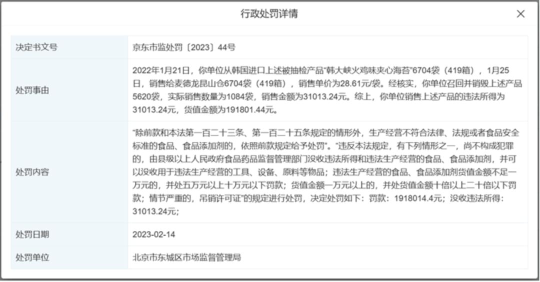 处罚详情显示,当事人从韩国进口被抽检产品“韩大峡火鸡味夹心海苔”,销售给麦德龙昆山仓6704袋(419箱),销售单价为28.61元/袋。