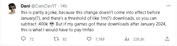 当然,他也声明了这只是玩笑式的计算方法,不能当真。因为Unity说了:只有从新规发布后签约的开发者,才会在2024年开始算这笔账。但如果今年这12个月的数据达标,那么从明年开始执行后,他确实就得为每月的安装量付一定费用了。