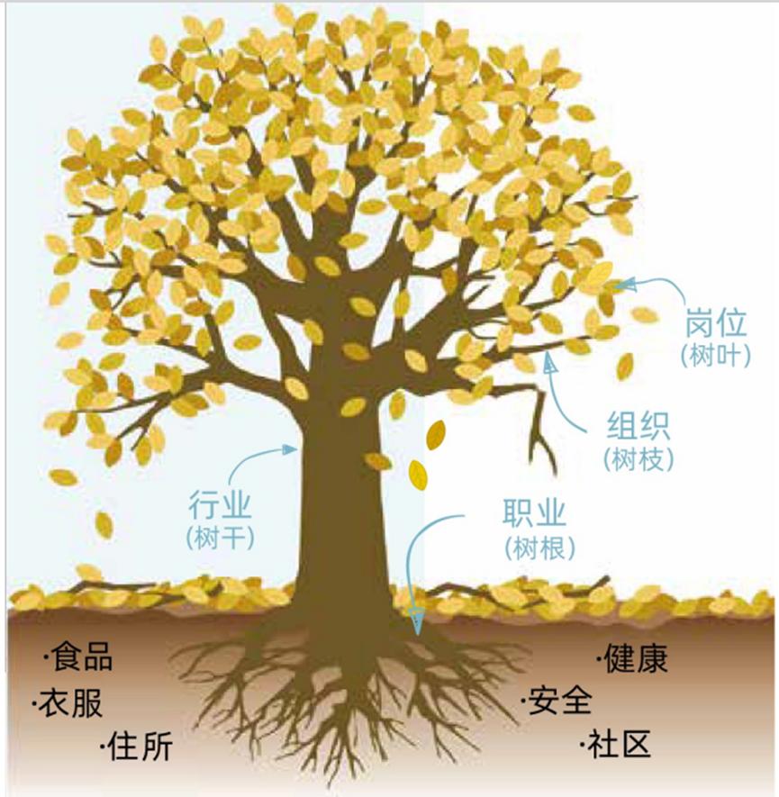 我们通过职业生态树从树叶、树枝、树干、树根四个不同的视角来看待我们的职业。