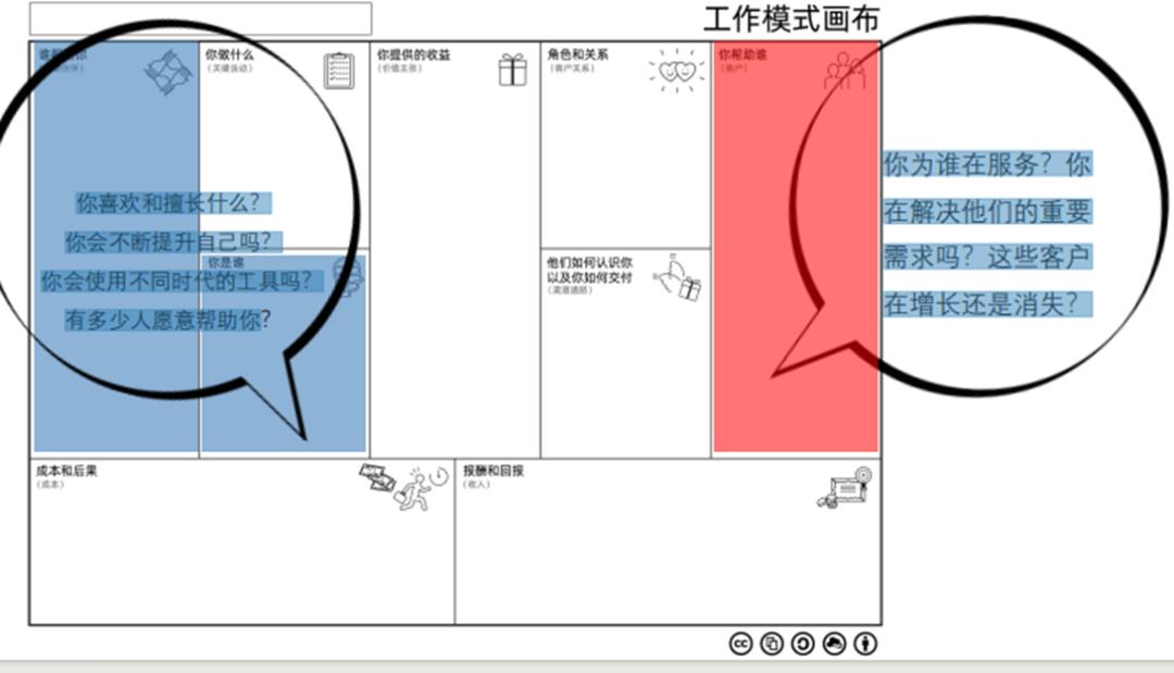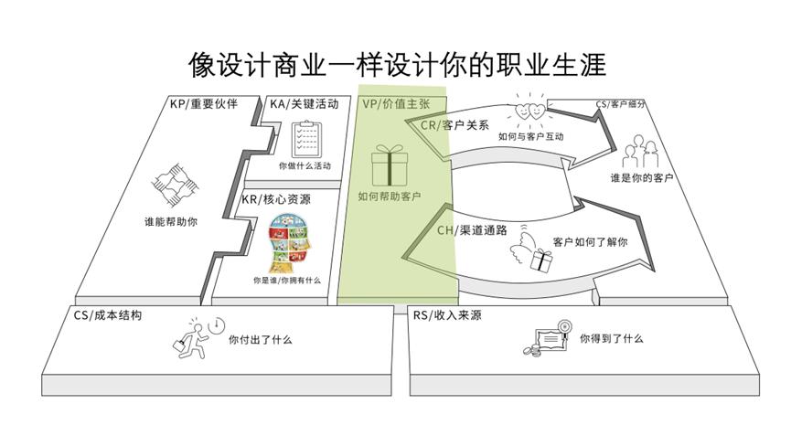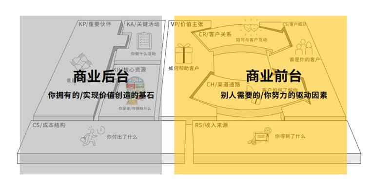 在这张个人画布中,价值主张为核心,因为清晰价值主张能够连接客户的需求与我们的差异化价值。价值主张以及它右边的部分叫做商业前台,左边部分叫做商业后台。