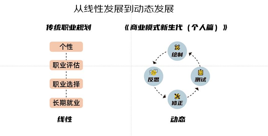 所以,现在我们强调另外一个概念,通过职业建模,动态地识别和设计职业生涯,通过绘制、反思、修正、测试四段式的职业重塑流程,拥抱快速变化的商业环境和自我。