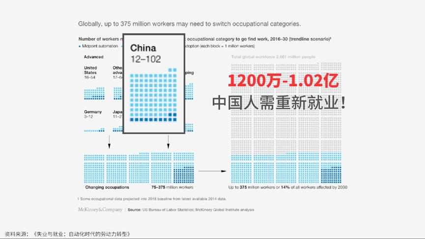 2016 年,麦肯锡出过一个报告,说根据一定的数据推算,接下来 15 年是职业大变迁的 15 年,就是中国有一个亿人需要重新就业。因为近几年的疫情、战争和科技的变化,这个时间大大缩短了。