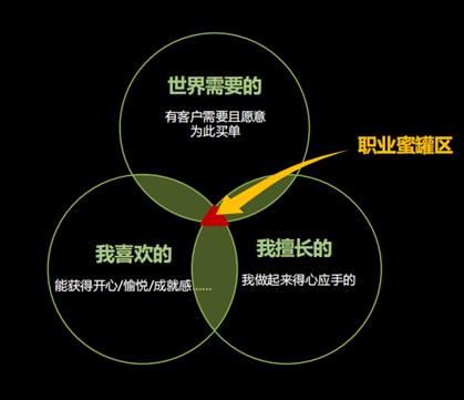 同时,你要了解自己擅长和喜欢的事情,而三者重合的部分,就是你的职业蜜罐区。
