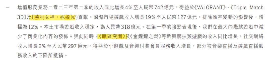 具体以上文提到的腾讯网易为例。在2023年H1财报中,腾讯就着重提到《暗区突围》和《胜利女神:妮姬》两款差异化产品所做出的贡献。